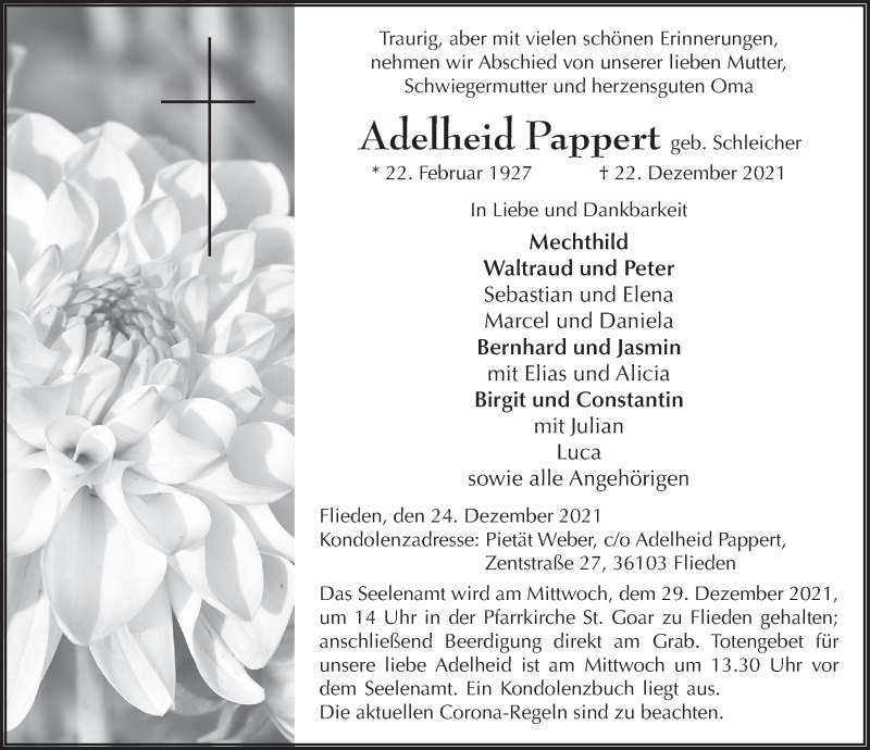 Hier finden Sie alle Traueranzeigen aus der Zeitung, die bisher für Adelheid Pappert erschienen sind. Weitere Traueranzeigen, die in der Zeitung erscheinen, werden hier ebenfalls aufgelistet