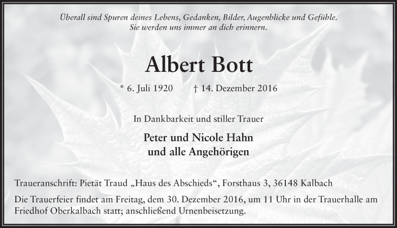 Hier finden Sie alle Traueranzeigen aus der Zeitung, die bisher für Albert Bott erschienen sind. Weitere Traueranzeigen, die in der Zeitung erscheinen, werden hier ebenfalls aufgelistet