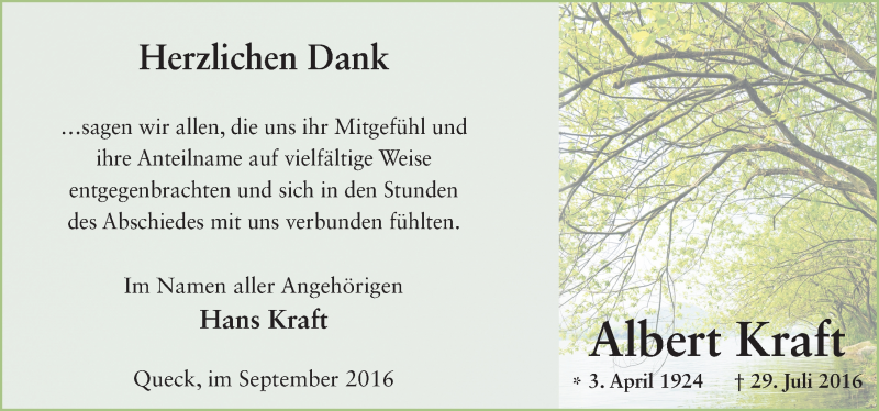Hier finden Sie alle Traueranzeigen aus der Zeitung, die bisher für Albert Kraft erschienen sind. Weitere Traueranzeigen, die in der Zeitung erscheinen, werden hier ebenfalls aufgelistet