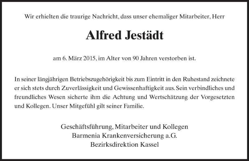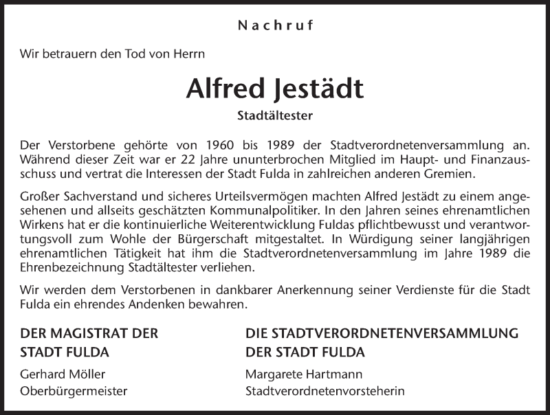 Hier finden Sie alle Traueranzeigen aus der Zeitung, die bisher für Alfred Jestädt erschienen sind. Weitere Traueranzeigen, die in der Zeitung erscheinen, werden hier ebenfalls aufgelistet