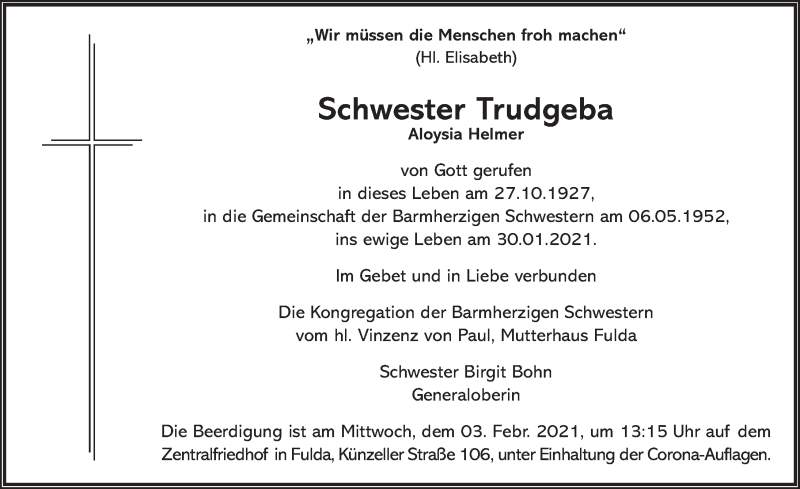 Hier finden Sie alle Traueranzeigen aus der Zeitung, die bisher für Aloysia Helmer erschienen sind. Weitere Traueranzeigen, die in der Zeitung erscheinen, werden hier ebenfalls aufgelistet