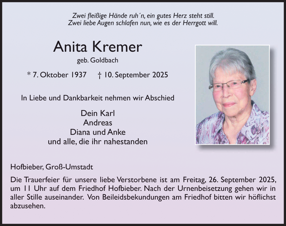 Hier finden Sie alle Traueranzeigen aus der Zeitung, die bisher für Anita Kremer erschienen sind. Weitere Traueranzeigen, die in der Zeitung erscheinen, werden hier ebenfalls aufgelistet