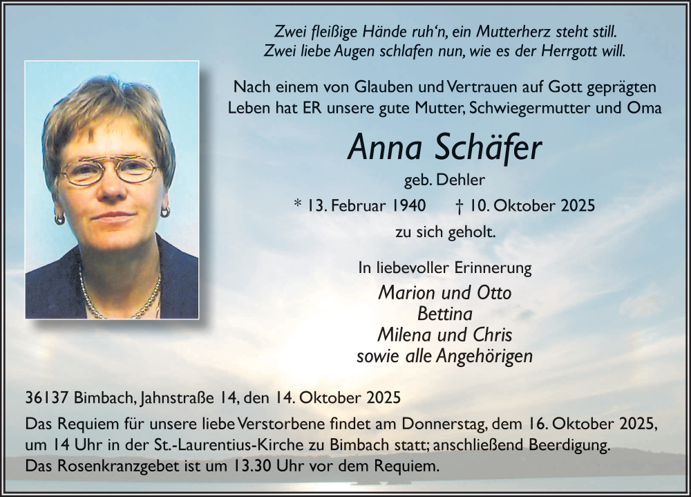 Hier finden Sie alle Traueranzeigen aus der Zeitung, die bisher für Anna Schäfer erschienen sind. Weitere Traueranzeigen, die in der Zeitung erscheinen, werden hier ebenfalls aufgelistet