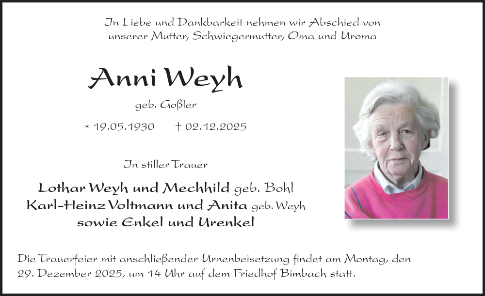 Hier finden Sie alle Traueranzeigen aus der Zeitung, die bisher für Anni Weyh erschienen sind. Weitere Traueranzeigen, die in der Zeitung erscheinen, werden hier ebenfalls aufgelistet