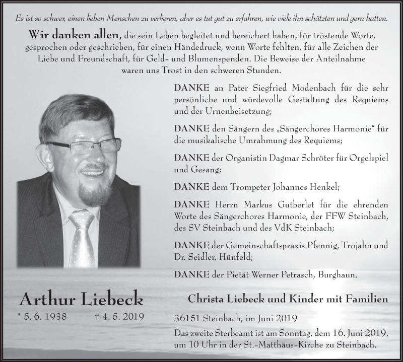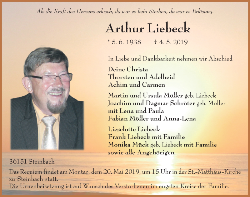 Hier finden Sie alle Traueranzeigen aus der Zeitung, die bisher für Arthur Liebeck erschienen sind. Weitere Traueranzeigen, die in der Zeitung erscheinen, werden hier ebenfalls aufgelistet