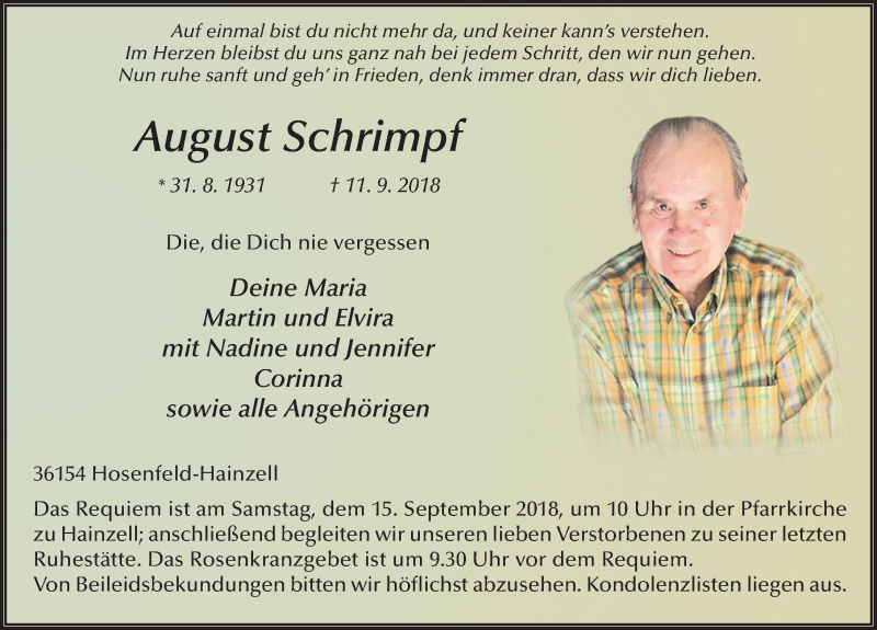 Hier finden Sie alle Traueranzeigen aus der Zeitung, die bisher für August Schrimpf erschienen sind. Weitere Traueranzeigen, die in der Zeitung erscheinen, werden hier ebenfalls aufgelistet