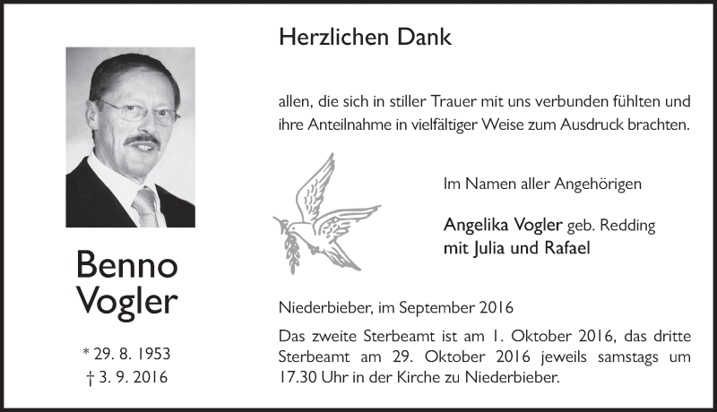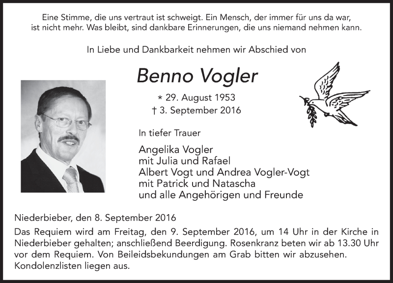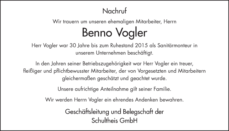 Hier finden Sie alle Traueranzeigen aus der Zeitung, die bisher für Benno Vogler erschienen sind. Weitere Traueranzeigen, die in der Zeitung erscheinen, werden hier ebenfalls aufgelistet