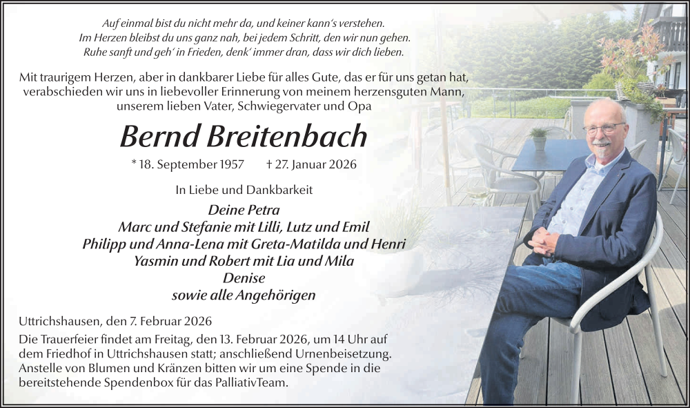Hier finden Sie alle Traueranzeigen aus der Zeitung, die bisher für Bernd Breitenbach erschienen sind. Weitere Traueranzeigen, die in der Zeitung erscheinen, werden hier ebenfalls aufgelistet
