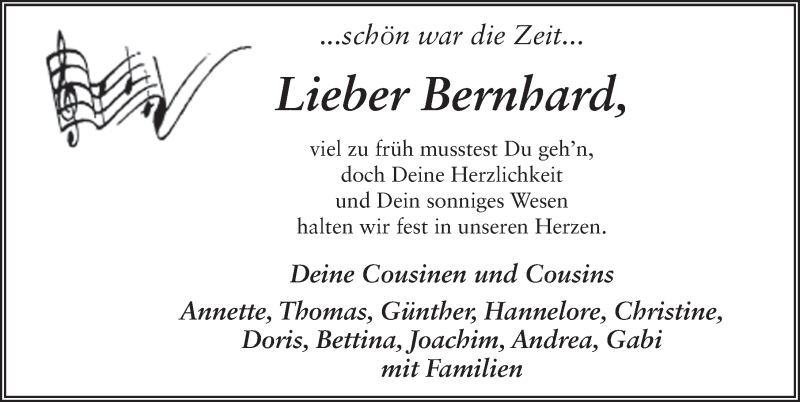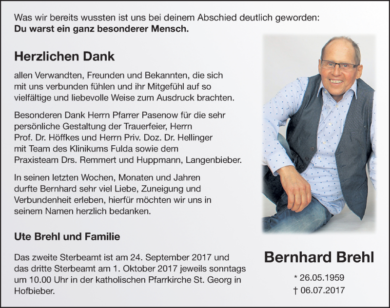 Hier finden Sie alle Traueranzeigen aus der Zeitung, die bisher für Bernhard Brehl erschienen sind. Weitere Traueranzeigen, die in der Zeitung erscheinen, werden hier ebenfalls aufgelistet