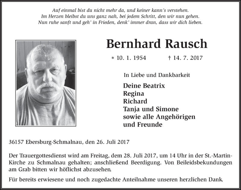 Hier finden Sie alle Traueranzeigen aus der Zeitung, die bisher für Bernhard Rausch erschienen sind. Weitere Traueranzeigen, die in der Zeitung erscheinen, werden hier ebenfalls aufgelistet