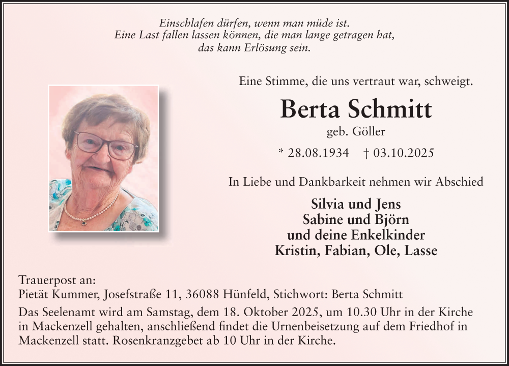 Hier finden Sie alle Traueranzeigen aus der Zeitung, die bisher für Berta Schmitt erschienen sind. Weitere Traueranzeigen, die in der Zeitung erscheinen, werden hier ebenfalls aufgelistet