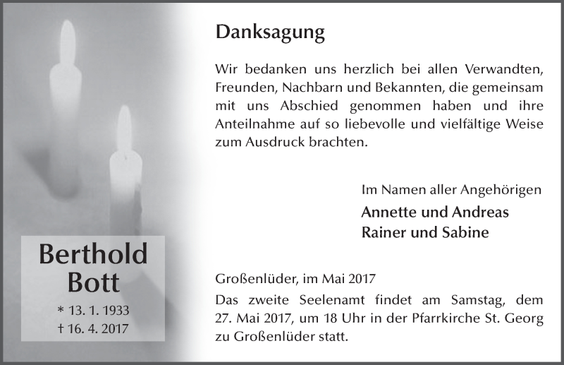 Hier finden Sie alle Traueranzeigen aus der Zeitung, die bisher für Berthold Bott erschienen sind. Weitere Traueranzeigen, die in der Zeitung erscheinen, werden hier ebenfalls aufgelistet