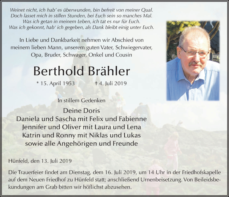 Hier finden Sie alle Traueranzeigen aus der Zeitung, die bisher für Berthold Brähler erschienen sind. Weitere Traueranzeigen, die in der Zeitung erscheinen, werden hier ebenfalls aufgelistet