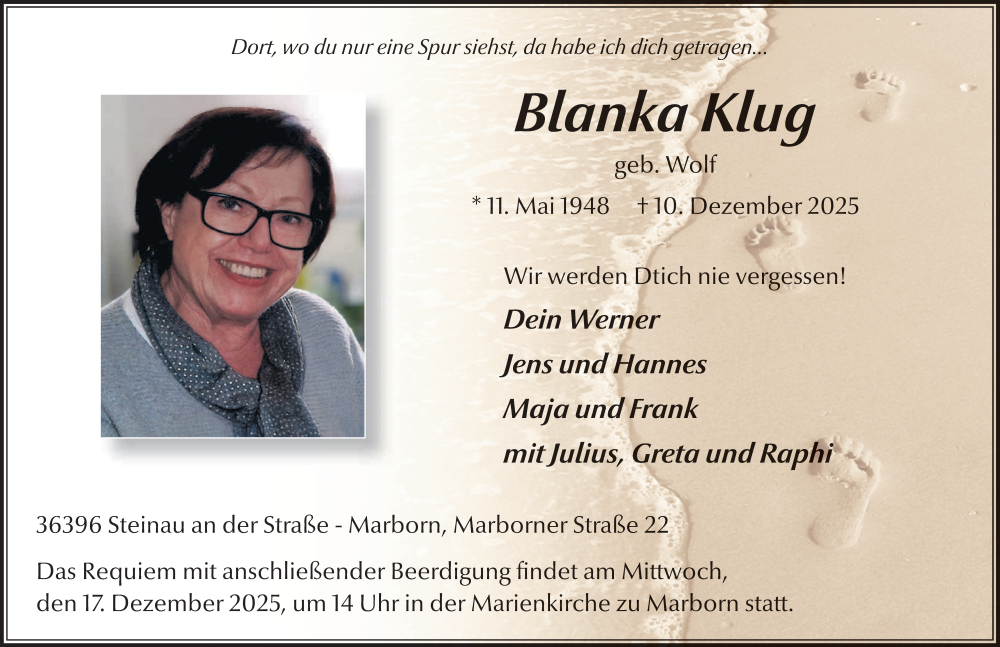 Hier finden Sie alle Traueranzeigen aus der Zeitung, die bisher für Blanka Klug erschienen sind. Weitere Traueranzeigen, die in der Zeitung erscheinen, werden hier ebenfalls aufgelistet