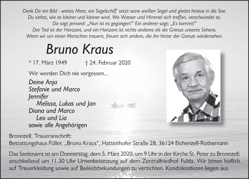 Hier finden Sie alle Traueranzeigen aus der Zeitung, die bisher für Bruno Kraus erschienen sind. Weitere Traueranzeigen, die in der Zeitung erscheinen, werden hier ebenfalls aufgelistet
