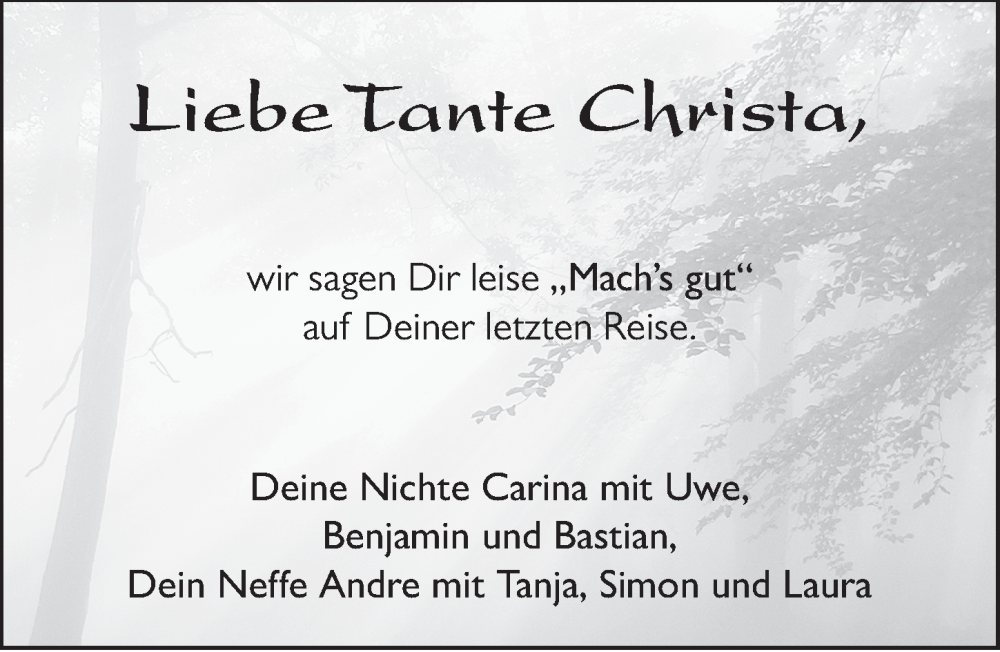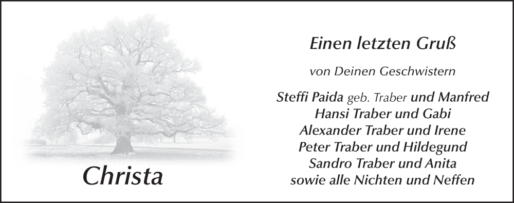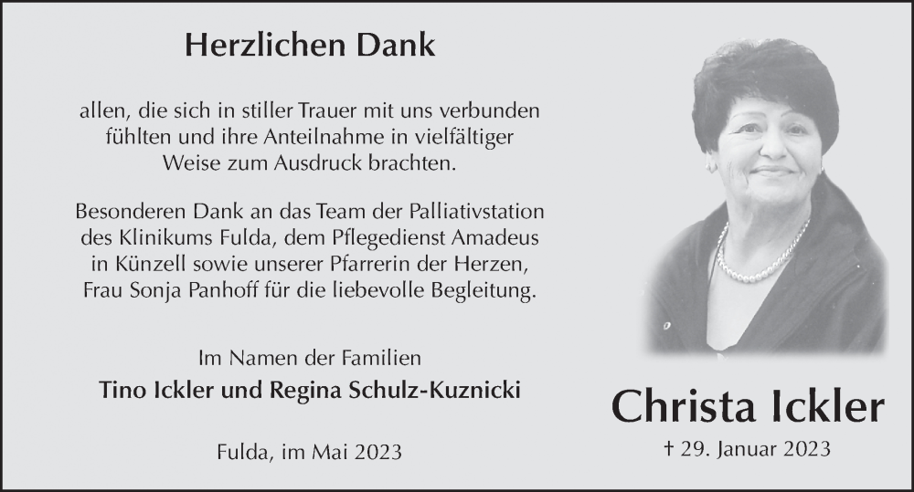 Hier finden Sie alle Traueranzeigen aus der Zeitung, die bisher für Christa Ickler erschienen sind. Weitere Traueranzeigen, die in der Zeitung erscheinen, werden hier ebenfalls aufgelistet