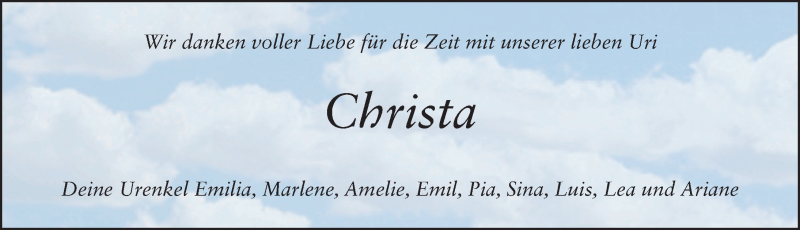 Hier finden Sie alle Traueranzeigen aus der Zeitung, die bisher für Christa Jörges erschienen sind. Weitere Traueranzeigen, die in der Zeitung erscheinen, werden hier ebenfalls aufgelistet
