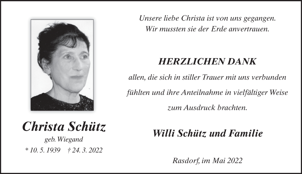 Hier finden Sie alle Traueranzeigen aus der Zeitung, die bisher für Christa Schütz erschienen sind. Weitere Traueranzeigen, die in der Zeitung erscheinen, werden hier ebenfalls aufgelistet