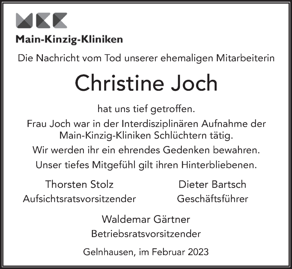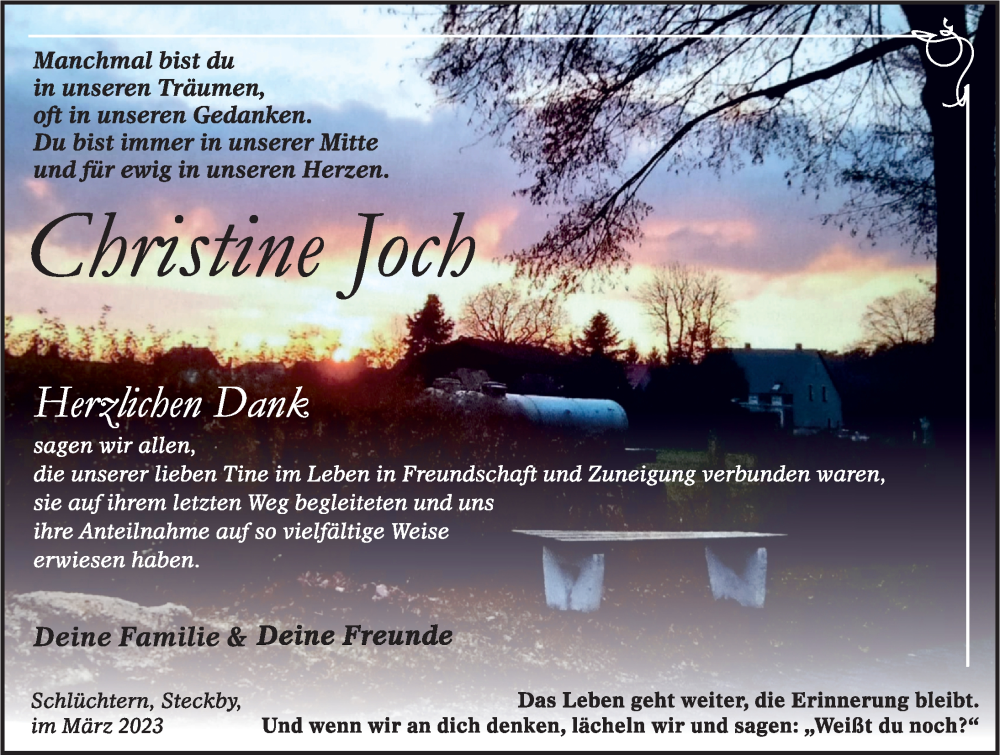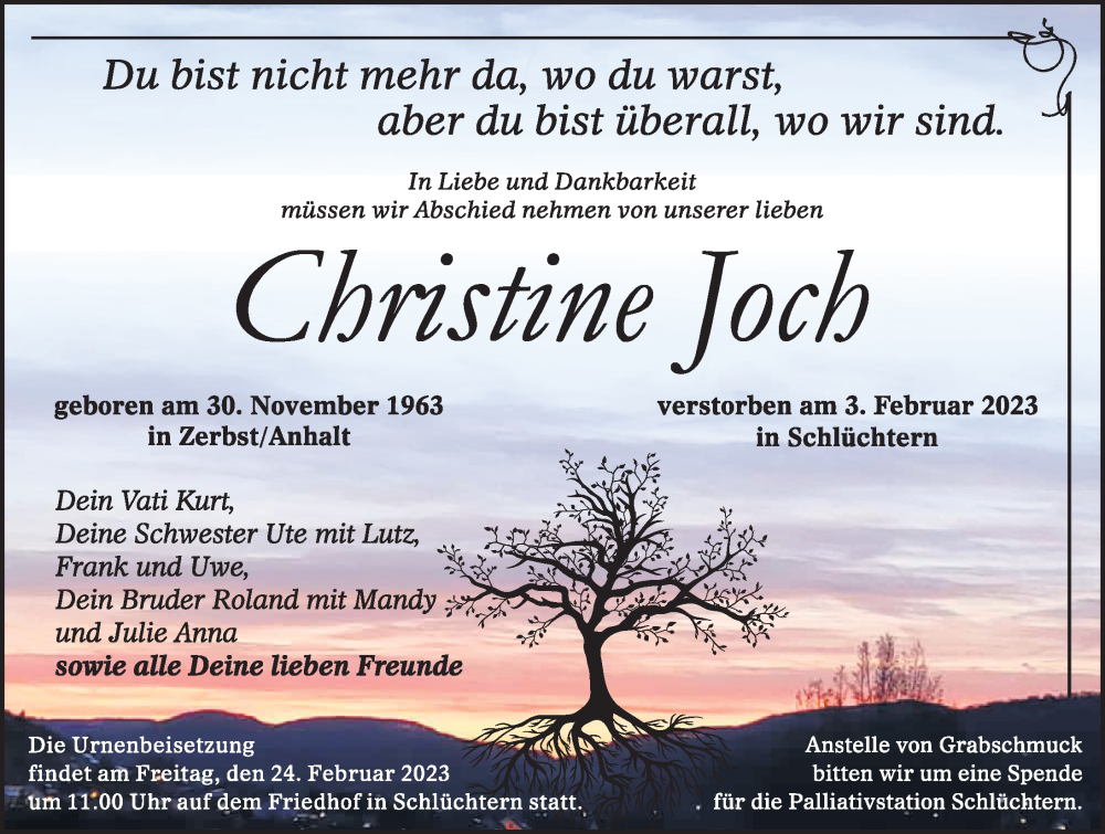 Hier finden Sie alle Traueranzeigen aus der Zeitung, die bisher für Christine Joch erschienen sind. Weitere Traueranzeigen, die in der Zeitung erscheinen, werden hier ebenfalls aufgelistet