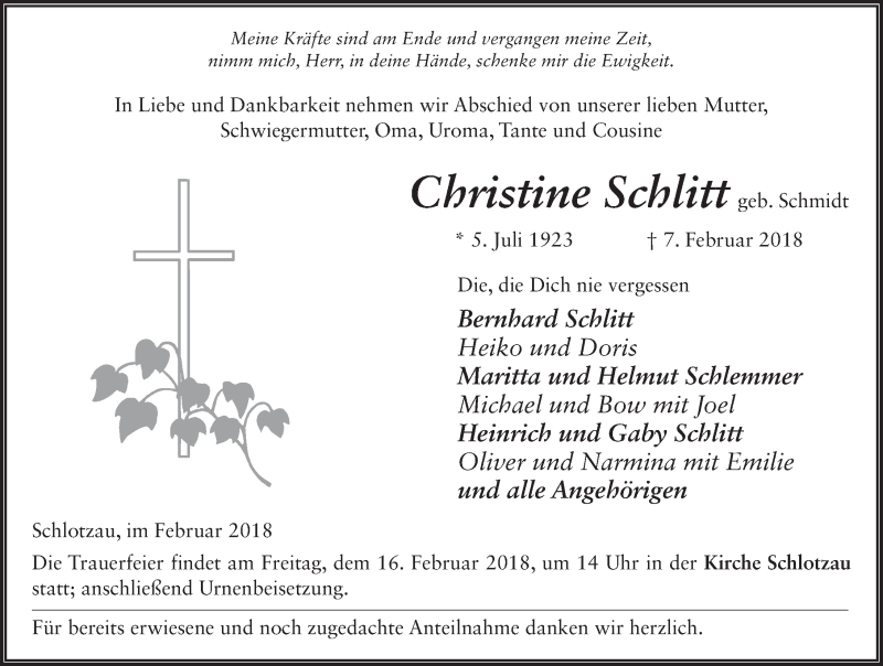 Hier finden Sie alle Traueranzeigen aus der Zeitung, die bisher für Christine Schlitt erschienen sind. Weitere Traueranzeigen, die in der Zeitung erscheinen, werden hier ebenfalls aufgelistet