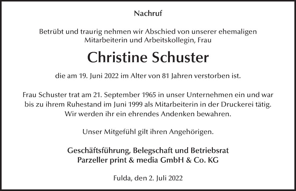 Hier finden Sie alle Traueranzeigen aus der Zeitung, die bisher für Christine Schuster erschienen sind. Weitere Traueranzeigen, die in der Zeitung erscheinen, werden hier ebenfalls aufgelistet