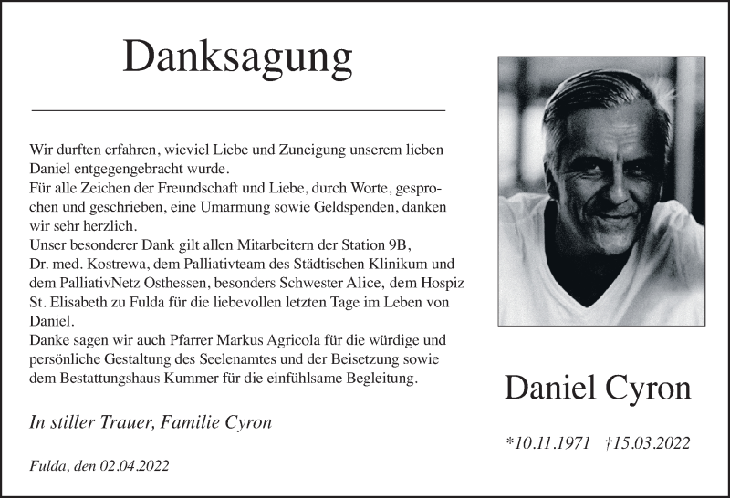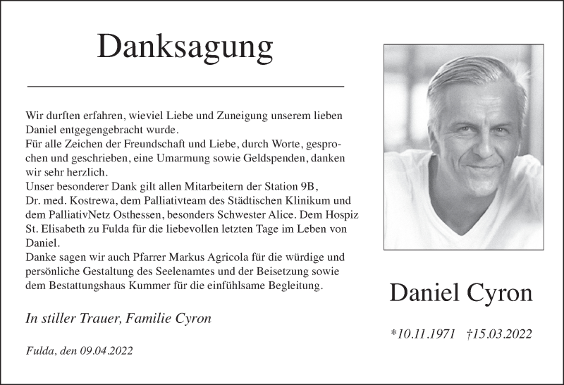 Hier finden Sie alle Traueranzeigen aus der Zeitung, die bisher für Daniel Cyron erschienen sind. Weitere Traueranzeigen, die in der Zeitung erscheinen, werden hier ebenfalls aufgelistet