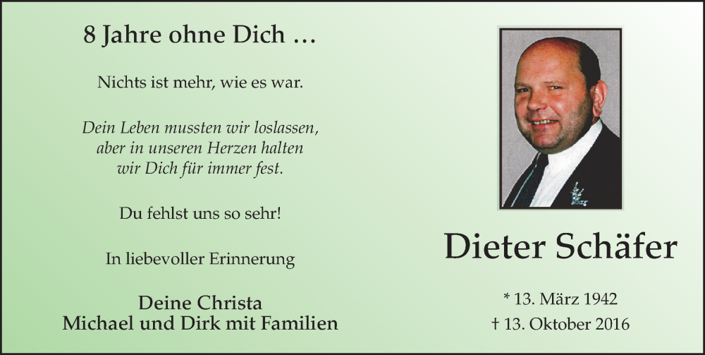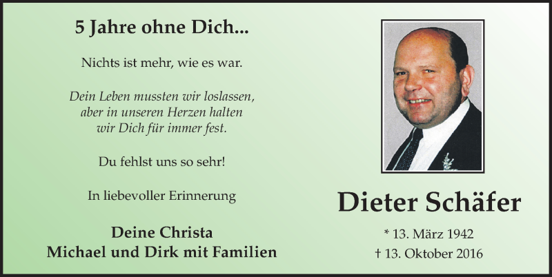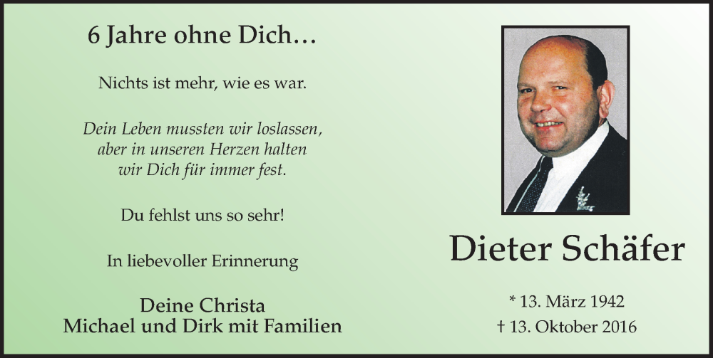 Hier finden Sie alle Traueranzeigen aus der Zeitung, die bisher für Dieter Schäfer erschienen sind. Weitere Traueranzeigen, die in der Zeitung erscheinen, werden hier ebenfalls aufgelistet