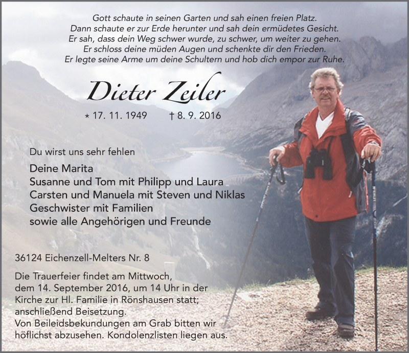 Hier finden Sie alle Traueranzeigen aus der Zeitung, die bisher für Dieter Zeiler erschienen sind. Weitere Traueranzeigen, die in der Zeitung erscheinen, werden hier ebenfalls aufgelistet