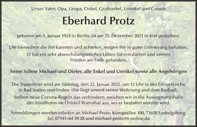 Hier finden Sie alle Traueranzeigen aus der Zeitung, die bisher für Eberhard Protz erschienen sind. Weitere Traueranzeigen, die in der Zeitung erscheinen, werden hier ebenfalls aufgelistet