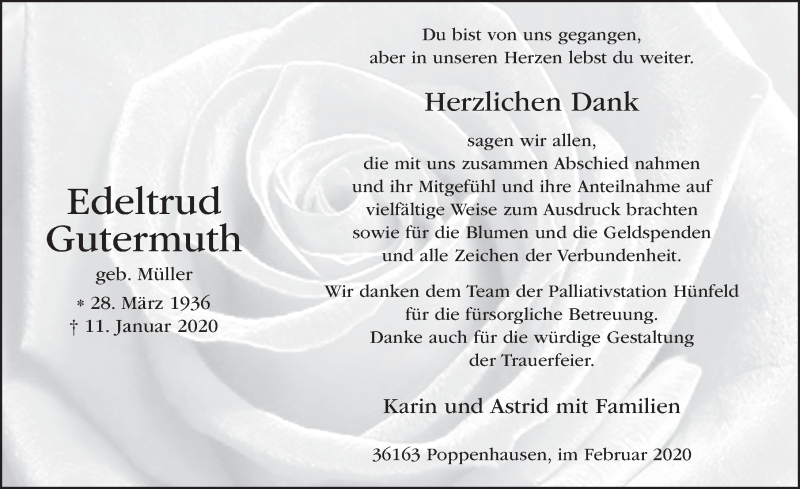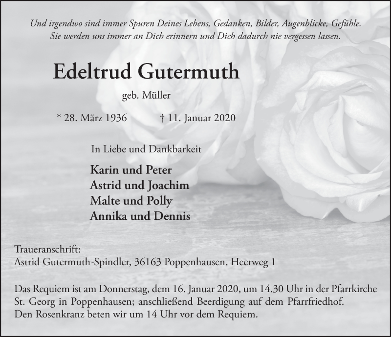 Hier finden Sie alle Traueranzeigen aus der Zeitung, die bisher für Edeltrud Gutermuth erschienen sind. Weitere Traueranzeigen, die in der Zeitung erscheinen, werden hier ebenfalls aufgelistet