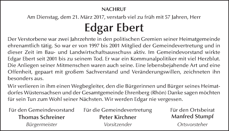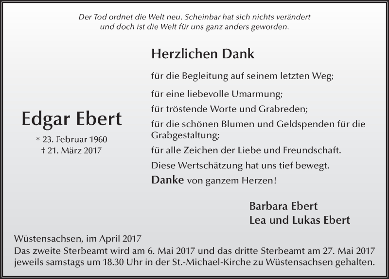 Hier finden Sie alle Traueranzeigen aus der Zeitung, die bisher für Edgar Ebert erschienen sind. Weitere Traueranzeigen, die in der Zeitung erscheinen, werden hier ebenfalls aufgelistet