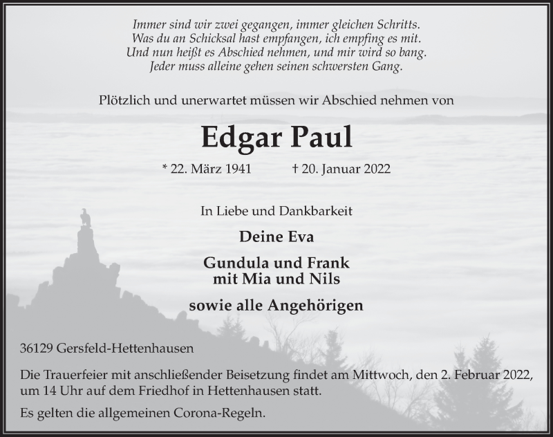 Hier finden Sie alle Traueranzeigen aus der Zeitung, die bisher für Edgar Paul erschienen sind. Weitere Traueranzeigen, die in der Zeitung erscheinen, werden hier ebenfalls aufgelistet