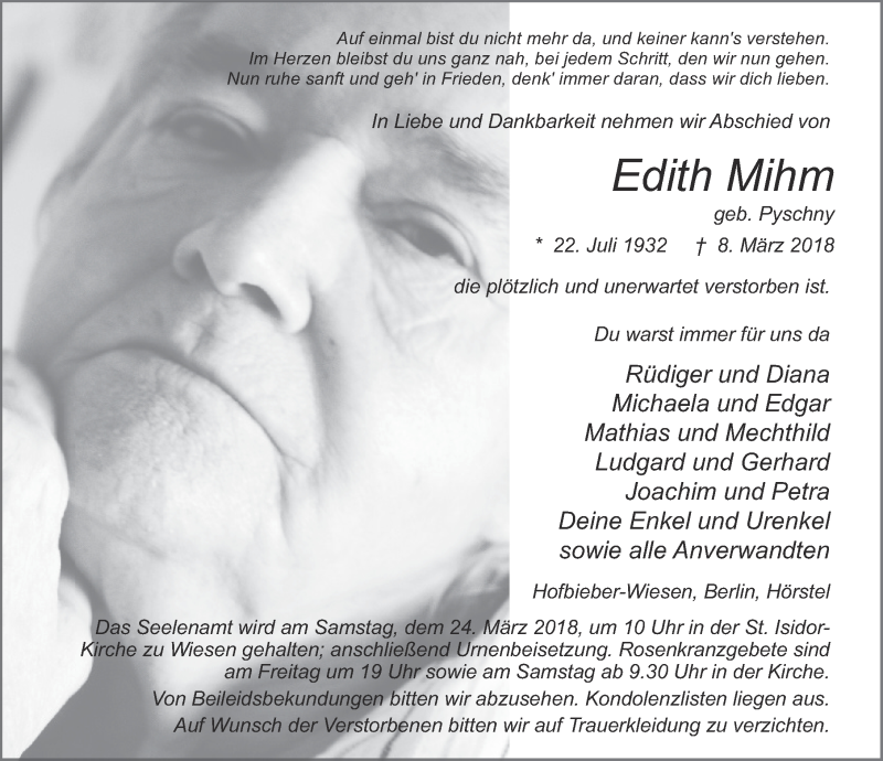 Hier finden Sie alle Traueranzeigen aus der Zeitung, die bisher für Edith Mihm erschienen sind. Weitere Traueranzeigen, die in der Zeitung erscheinen, werden hier ebenfalls aufgelistet