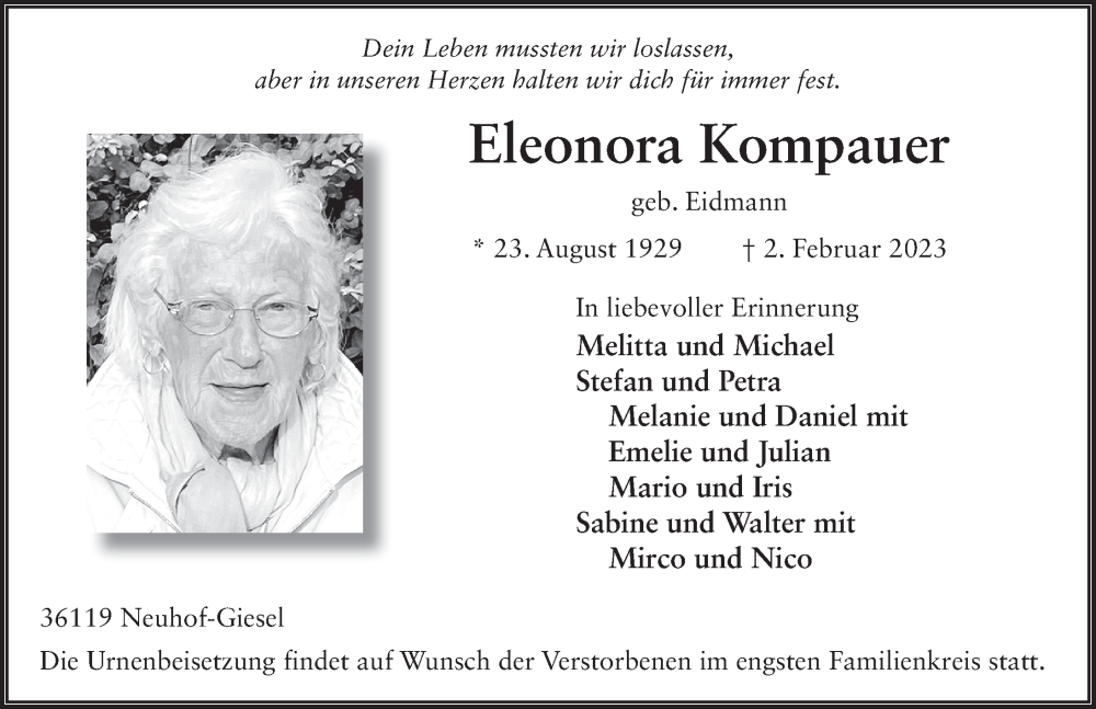 Hier finden Sie alle Traueranzeigen aus der Zeitung, die bisher für Eleonora Kompauer erschienen sind. Weitere Traueranzeigen, die in der Zeitung erscheinen, werden hier ebenfalls aufgelistet