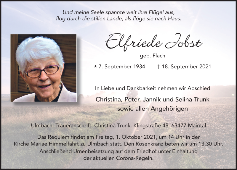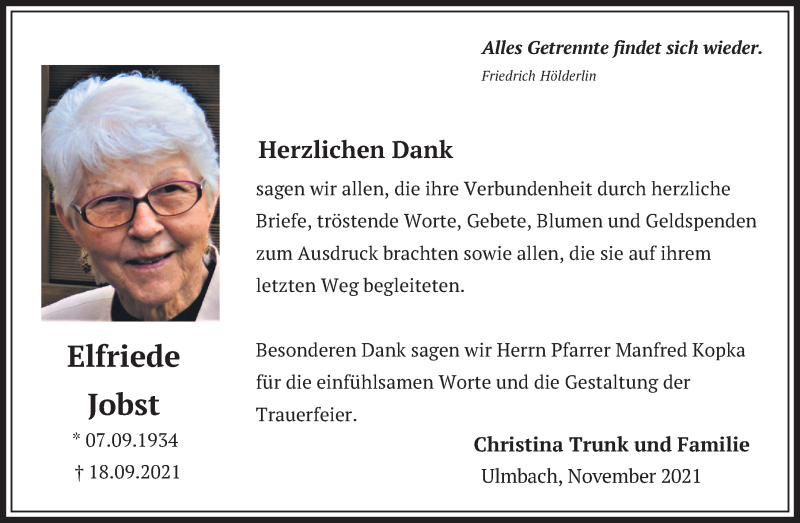 Hier finden Sie alle Traueranzeigen aus der Zeitung, die bisher für Elfriede Jobst erschienen sind. Weitere Traueranzeigen, die in der Zeitung erscheinen, werden hier ebenfalls aufgelistet