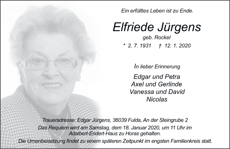 Hier finden Sie alle Traueranzeigen aus der Zeitung, die bisher für Elfriede Jürgens erschienen sind. Weitere Traueranzeigen, die in der Zeitung erscheinen, werden hier ebenfalls aufgelistet