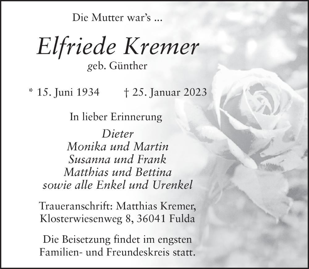 Hier finden Sie alle Traueranzeigen aus der Zeitung, die bisher für Elfriede Kremer erschienen sind. Weitere Traueranzeigen, die in der Zeitung erscheinen, werden hier ebenfalls aufgelistet