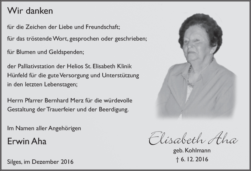 Hier finden Sie alle Traueranzeigen aus der Zeitung, die bisher für Elisabeth Aha erschienen sind. Weitere Traueranzeigen, die in der Zeitung erscheinen, werden hier ebenfalls aufgelistet