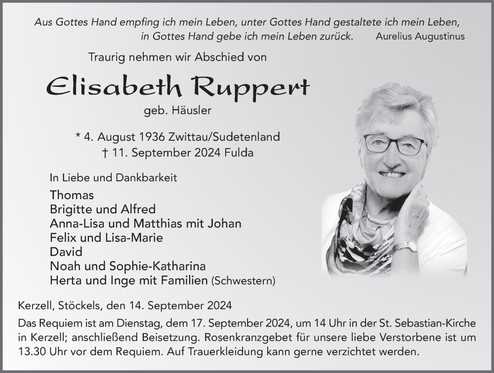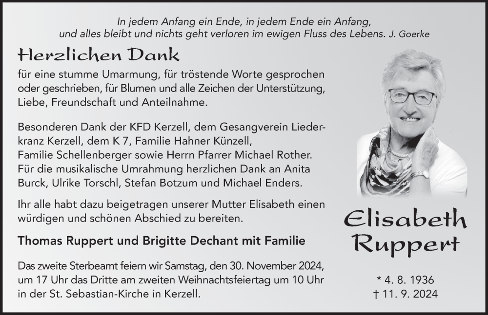 Hier finden Sie alle Traueranzeigen aus der Zeitung, die bisher für Elisabeth Ruppert erschienen sind. Weitere Traueranzeigen, die in der Zeitung erscheinen, werden hier ebenfalls aufgelistet
