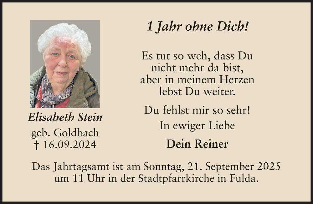 Hier finden Sie alle Traueranzeigen aus der Zeitung, die bisher für Elisabeth Stein erschienen sind. Weitere Traueranzeigen, die in der Zeitung erscheinen, werden hier ebenfalls aufgelistet