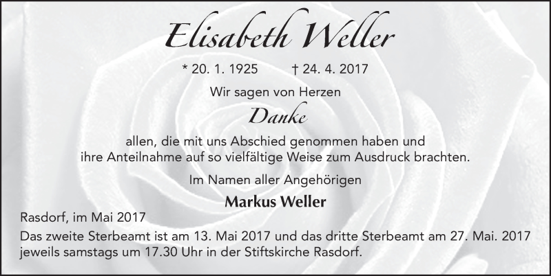 Hier finden Sie alle Traueranzeigen aus der Zeitung, die bisher für Elisabeth Weller erschienen sind. Weitere Traueranzeigen, die in der Zeitung erscheinen, werden hier ebenfalls aufgelistet