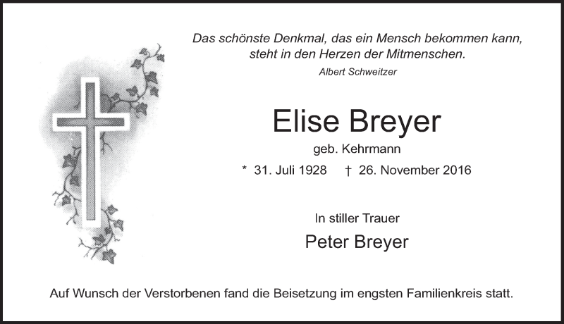 Hier finden Sie alle Traueranzeigen aus der Zeitung, die bisher für Elise Breyer erschienen sind. Weitere Traueranzeigen, die in der Zeitung erscheinen, werden hier ebenfalls aufgelistet