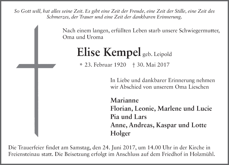 Hier finden Sie alle Traueranzeigen aus der Zeitung, die bisher für Elise Kempel erschienen sind. Weitere Traueranzeigen, die in der Zeitung erscheinen, werden hier ebenfalls aufgelistet