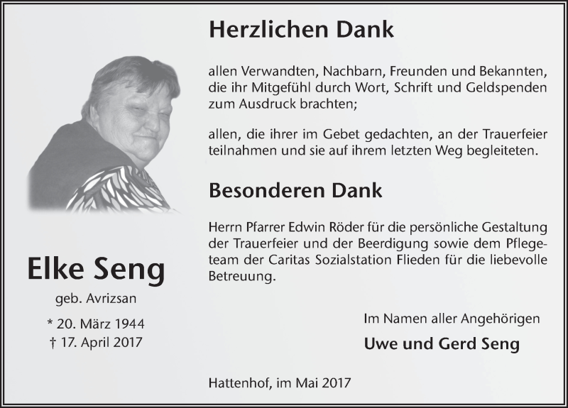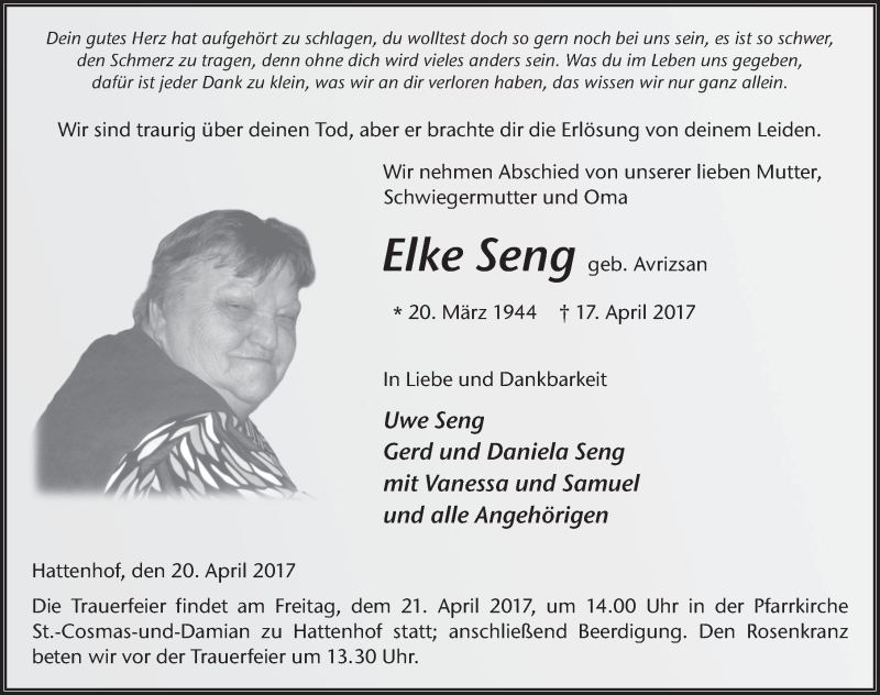 Hier finden Sie alle Traueranzeigen aus der Zeitung, die bisher für Elke Seng erschienen sind. Weitere Traueranzeigen, die in der Zeitung erscheinen, werden hier ebenfalls aufgelistet