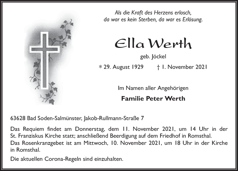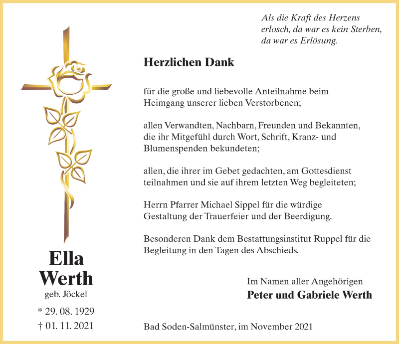Hier finden Sie alle Traueranzeigen aus der Zeitung, die bisher für Ella Werth erschienen sind. Weitere Traueranzeigen, die in der Zeitung erscheinen, werden hier ebenfalls aufgelistet