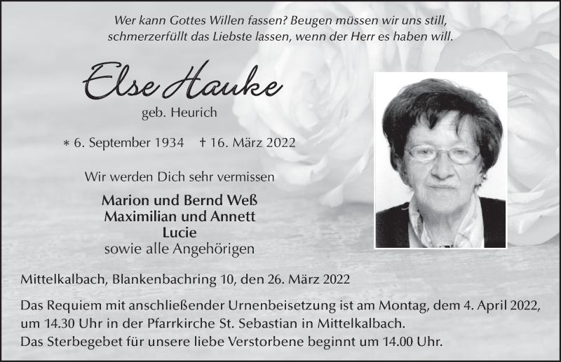 Hier finden Sie alle Traueranzeigen aus der Zeitung, die bisher für Else Hauke erschienen sind. Weitere Traueranzeigen, die in der Zeitung erscheinen, werden hier ebenfalls aufgelistet