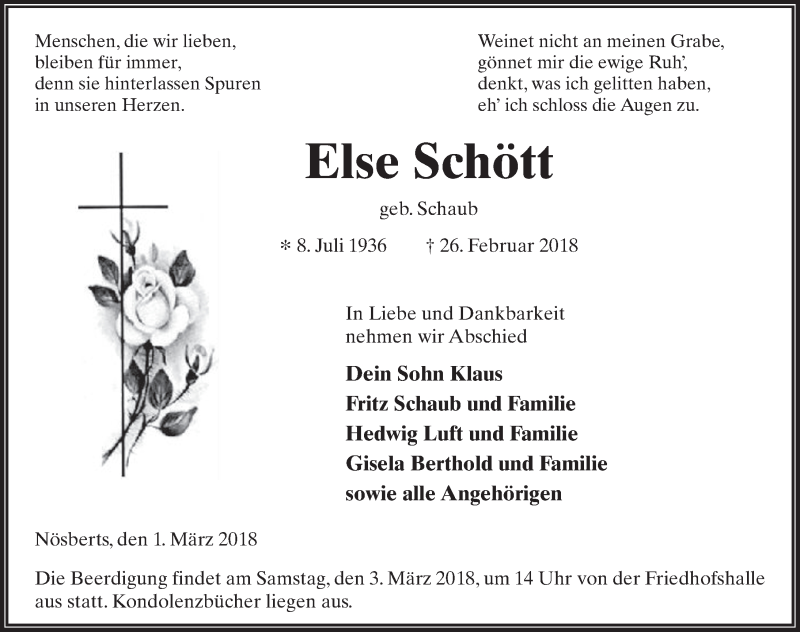 Hier finden Sie alle Traueranzeigen aus der Zeitung, die bisher für Else Schött erschienen sind. Weitere Traueranzeigen, die in der Zeitung erscheinen, werden hier ebenfalls aufgelistet