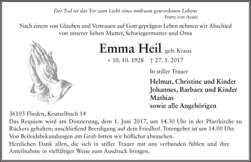 Hier finden Sie alle Traueranzeigen aus der Zeitung, die bisher für Emma Heil erschienen sind. Weitere Traueranzeigen, die in der Zeitung erscheinen, werden hier ebenfalls aufgelistet