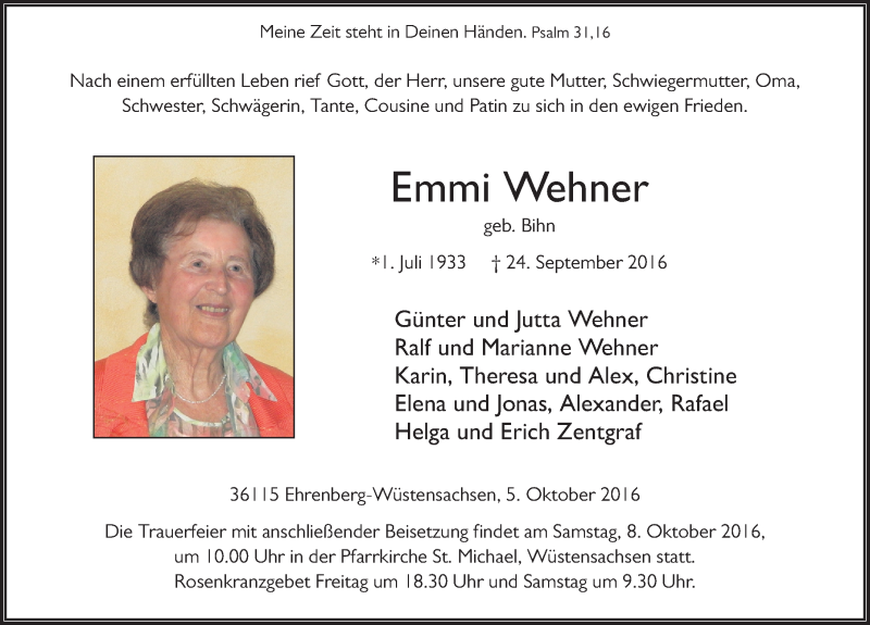 Hier finden Sie alle Traueranzeigen aus der Zeitung, die bisher für Emmi Wehner erschienen sind. Weitere Traueranzeigen, die in der Zeitung erscheinen, werden hier ebenfalls aufgelistet