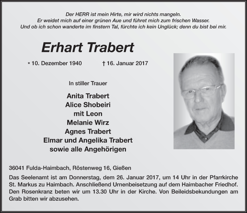 Hier finden Sie alle Traueranzeigen aus der Zeitung, die bisher für Erhard Trabert erschienen sind. Weitere Traueranzeigen, die in der Zeitung erscheinen, werden hier ebenfalls aufgelistet